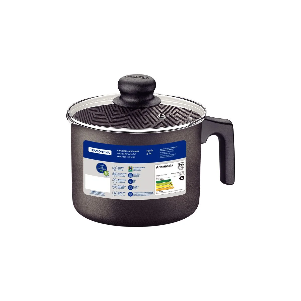Para calentar el agua de su té o café, cuente con el hervidor Tramontina Paris en aluminio con revestimiento interno y externo antiadherente Starflon Max plomo con tapa de vidrio 16 centímetros 2,7 litros. Está fabricado en aluminio de 1,6 milímetros de espesor y posee revestimiento interno y externo con antiadherente Starflon Max, dos características que permiten calentar rápidamente los alimentos sin que se peguen en la superficie. Su mango es de baquelita y el agarrador de la tapa de vidrio templado es de nylon, ambos materiales son antitérmicos y no se calientan, por lo que el manejo es mucho más cómodo. ¡También es apto para lavavajillas, lo que garantizará un menor tiempo de limpieza!