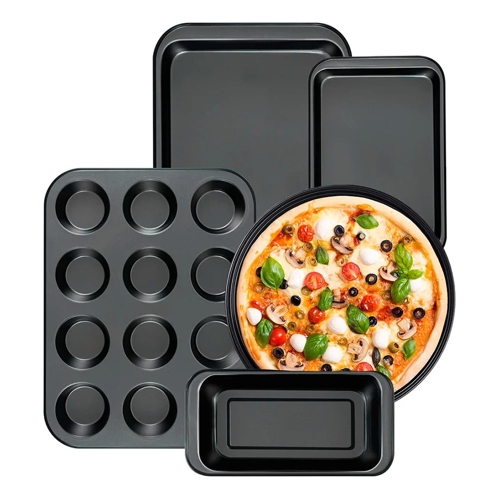 Juego completo de utensilios para hornear de 5 piezas: incluye un molde redondo para pizzas, un molde para pan, un molde para muffins y dos moldes rectangulares de diferente medida. Todas las piezas de nuestro juego de hornear fueron diseñadas para encajar perfectamente entre sí, ahorrándote un valioso espacio en tus armarios de cocina.