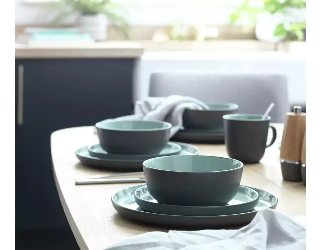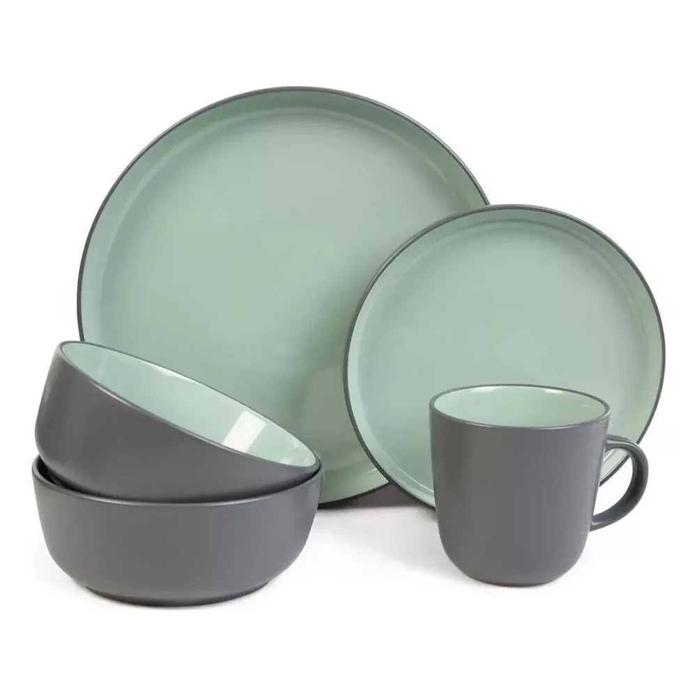 Juego de vajilla de 16 piezas fabricado en cerámica de excelente calidad, ideal para uso diario o para vestir la mesa en ocasiones especiales. Su diseño moderno en tono verde agua aporta un estilo elegante y armonioso, combinando fácilmente con distintos tipos de decoración.