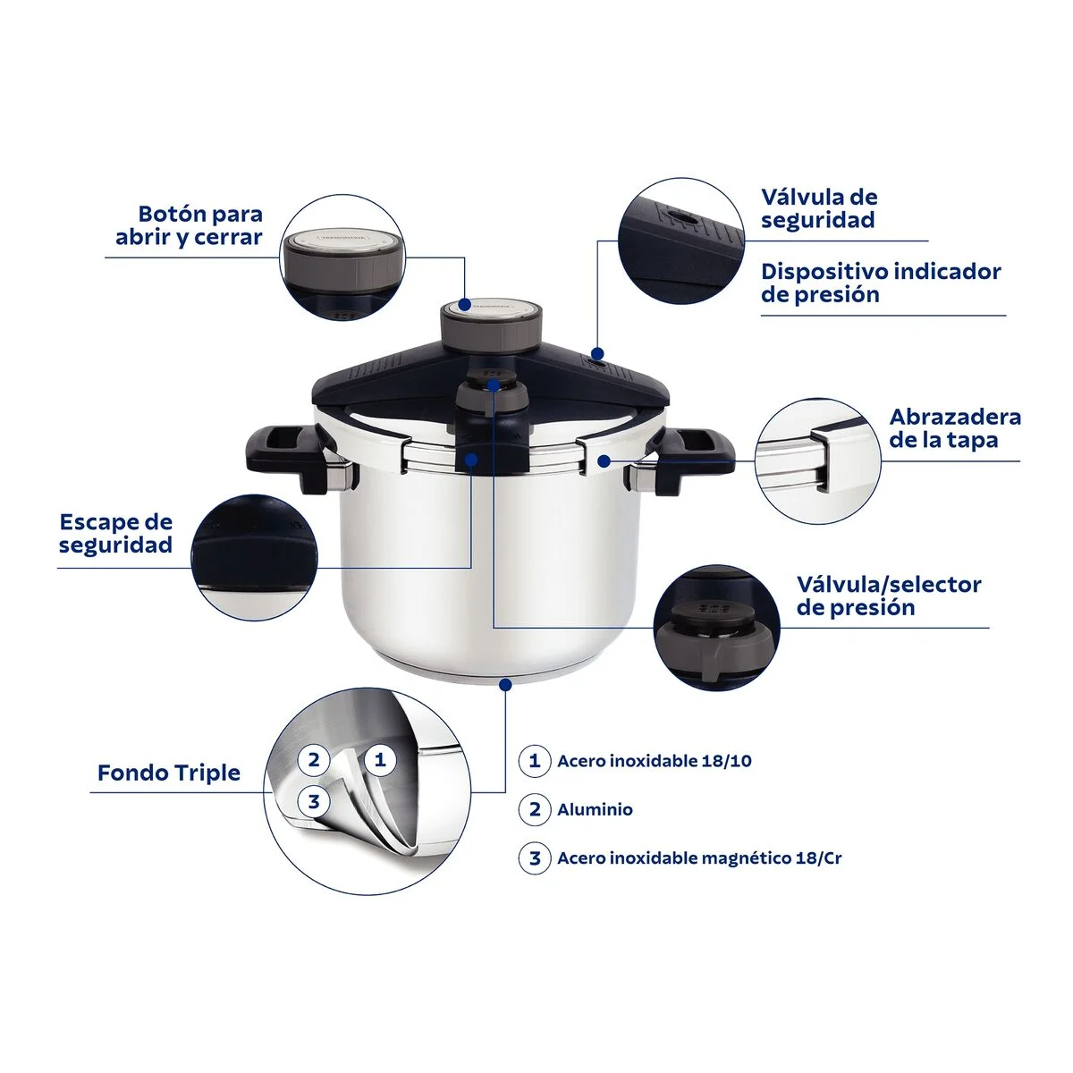 El fondo triple (acero inoxidable + aluminio + acero inoxidable) distribuye el calor uniformemente, proporcionando una cocci?n m?s r?pida y uniforme, ahorrando energ?a y manteniendo los alimentos calientes durante un tiempo mayor.