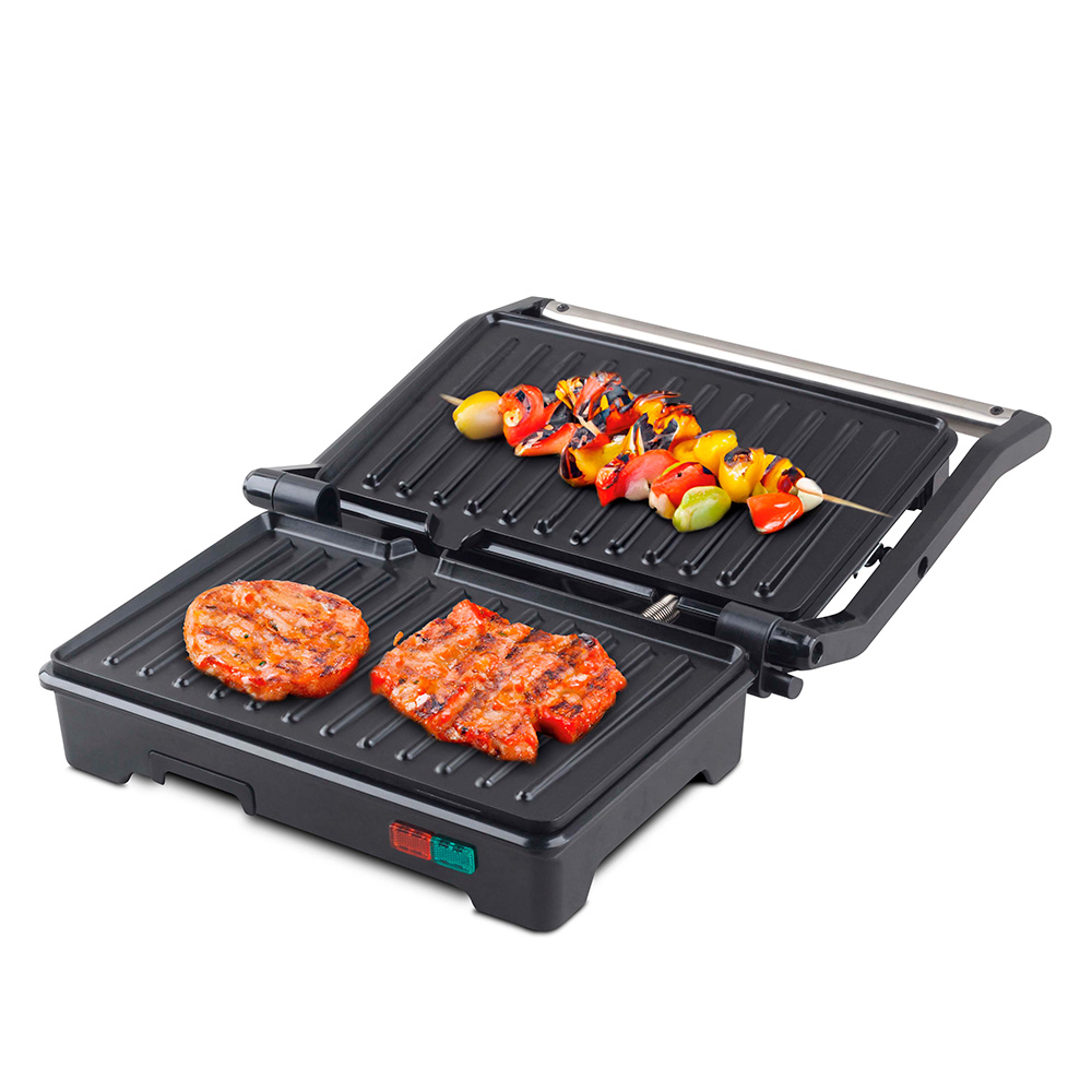 Su diseño cuenta con asa fría al tacto y apertura de 90° y 180°, lo que permite utilizarla como grill de contacto o plancha abierta. Incluye accesorio calienta panes, luces de encendido y listo, y bandeja recoge aceite para una cocción más limpia.